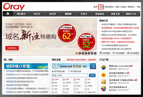 1、进入Oray官方网站:http://www.oray.com/, 点击右上角的"注册",注册一个贝锐账号(如果已经拥有Oray的账号,无需再注册)