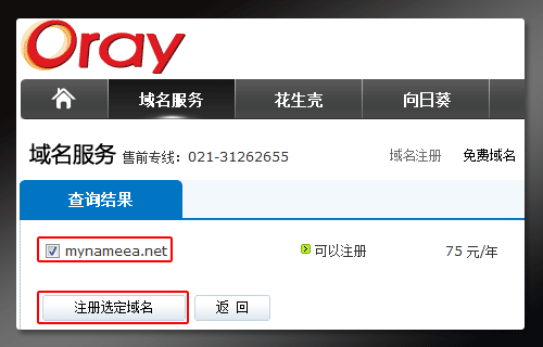 3、兑换成功后,打开【域名服务】页面:http://domain.oray.com/ ,输入您要注册的域名,选择.net后缀,点击"查询"。