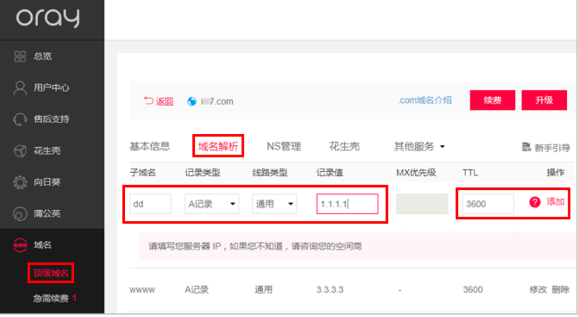 子域名:如果要设置www.oray.com 此子域名,那么子域名的空只需要填www即可;