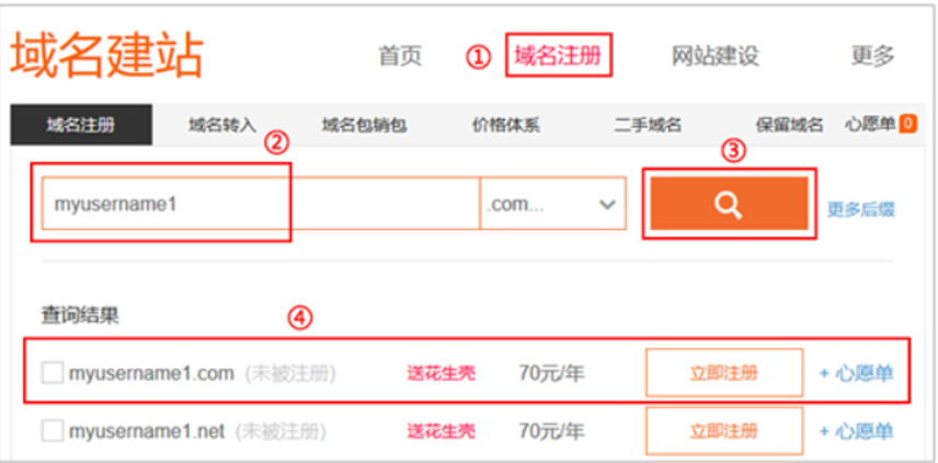 查询结果若显示可以注册,点击"立即注册"即可注册,若显示已被注册,请重新查询域名。