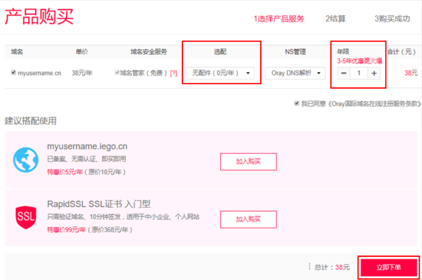 5、选择年限,点击【立即下单】,支付相应的金额即可。