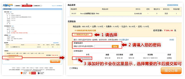 3、在提交订单页中,选择"使用京东礼品卡",然后输入礼品卡的密码,点击添加即可将礼品卡添加在订单中,然后根据您的需要选择好使用的礼品卡,一次可使用多张,点击提交订单即可完成操作。