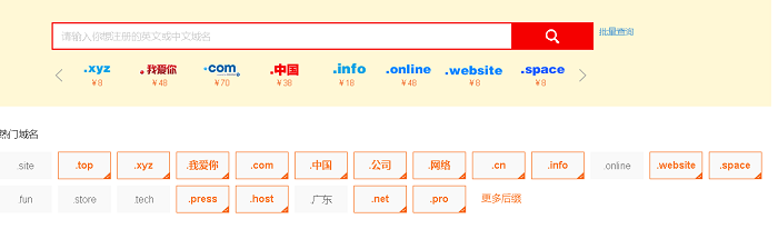 进入贝锐官网,点击【域名】——【域名注册】,在域名注册下面的文本框输入要注册的域名的前缀,在“热门域名”选择后缀,点击文本框后面的"查询",只要域名未被注册,在查询结果对应域名后面都会有一个“立即注册”的按钮。