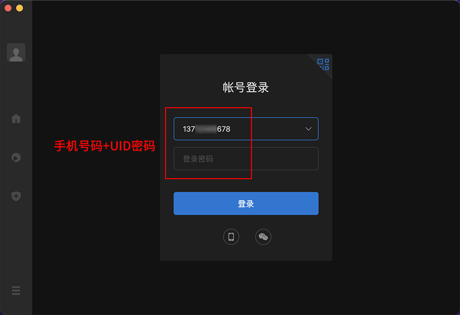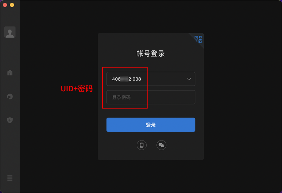 在“账号登录”方式里,支持填入“手机号”或“UID”以及密码进行登录。