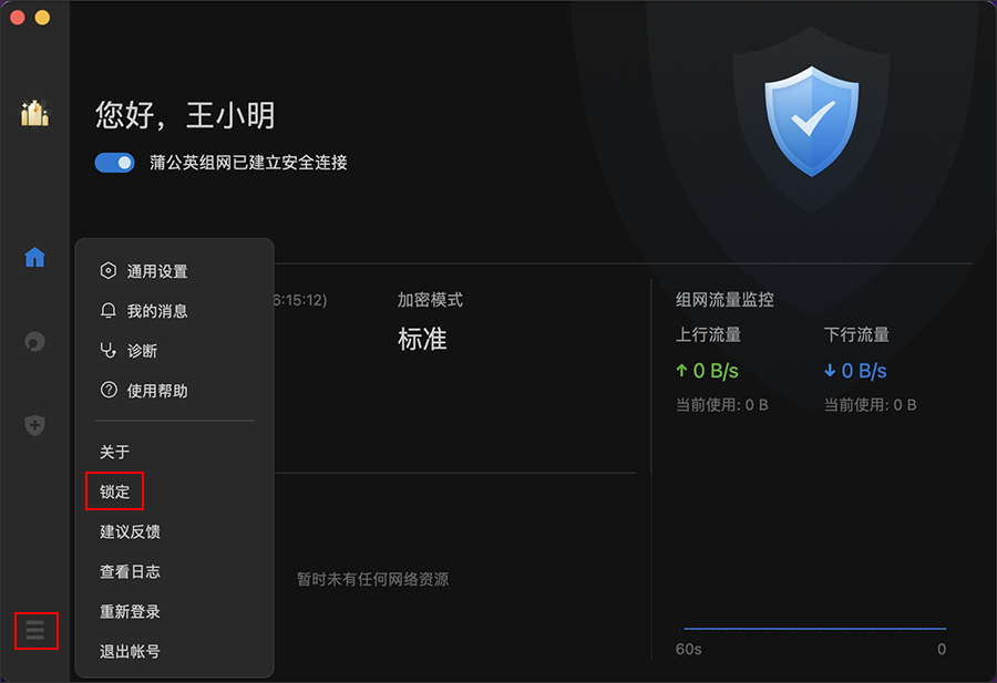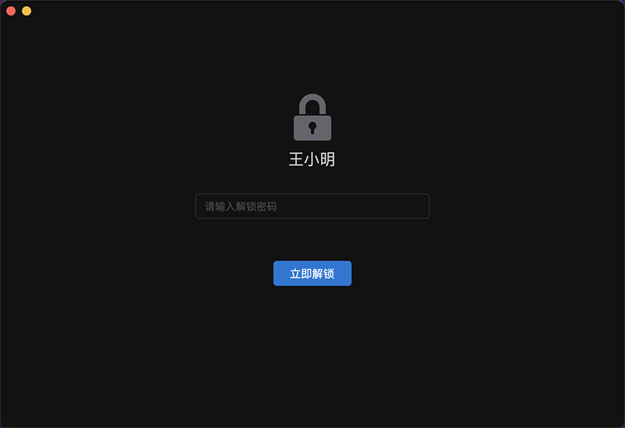 点击“锁定”,把蒲公英客户端软件进行锁定,需输入该成员的登录密码访客解锁,若该成员有绑定手机,可切换为手机验证码进行解锁。