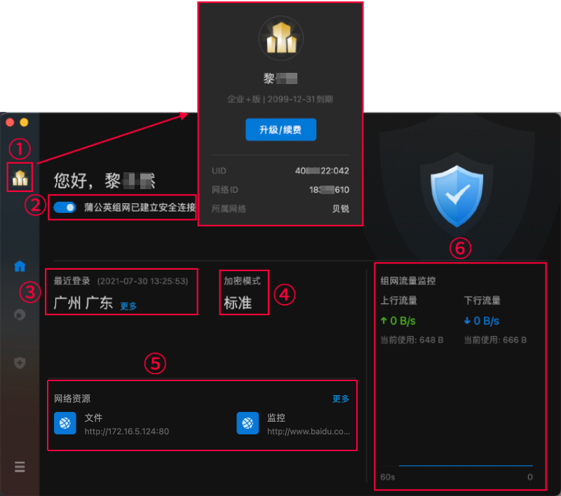 ①显示当前成员的名称,服务等级、服务到期时间、UID/网络ID信息、所属的网络名称;