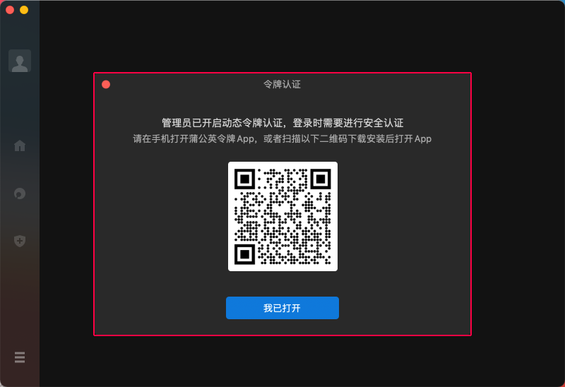 (2)开启二次验证功能后,首次登录企业版访问端将提示下载安装蒲公英企业版APP进行令牌绑定。已下载蒲公英企业版APP进的用户打开APP后,点击“我已打开”。