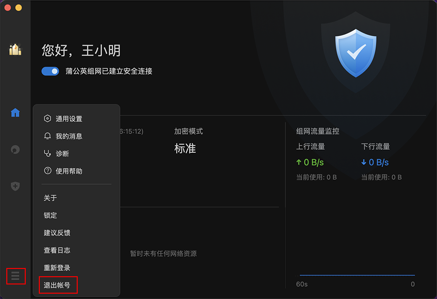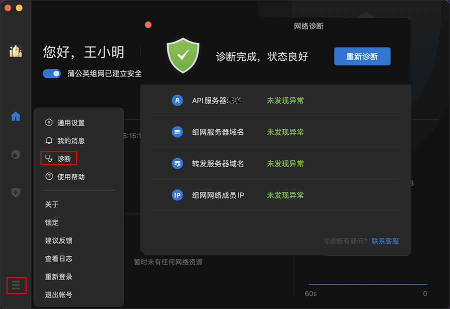 点击蒲公英客户端软件左下角菜单按钮,可以对客户端进行常规的设置、客户端诊断、查看使用帮助、版本信息和日志、重登、注销账号和退出客户端等操作。