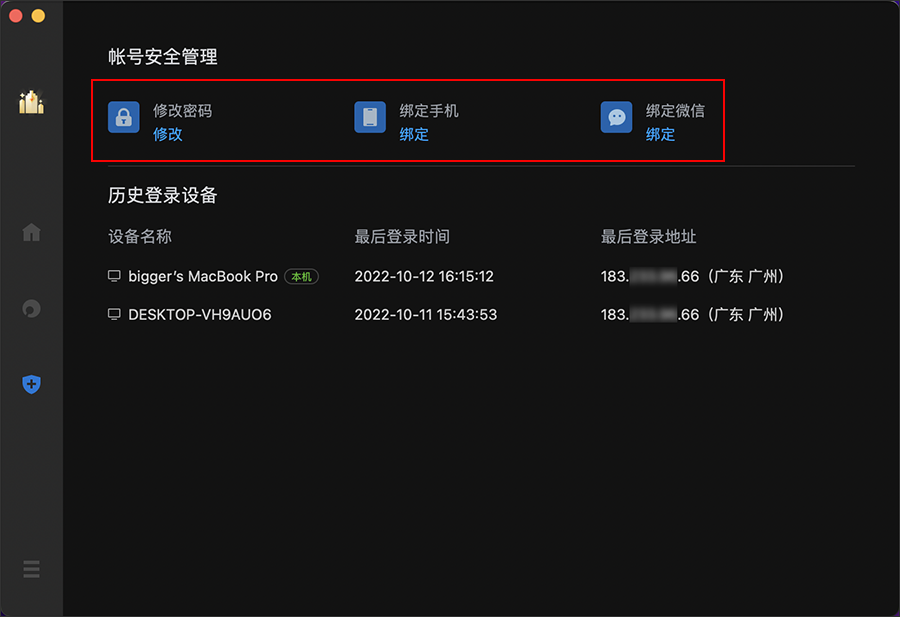③“最近登录”中显示当前访问端登录的地区、时间 、点击“更多”,可查看最近登录的设备列表;