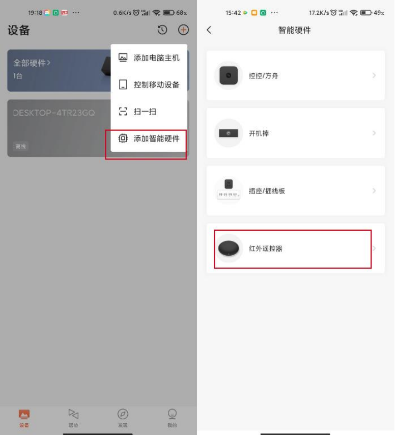 打开向日葵远程控制 App,在【设备】界面,点击右上角添加按钮“+”,选择“添加智能硬件”-“遥控器”
