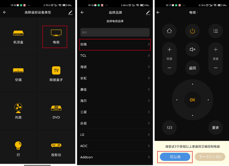 下图,选择电器种类“电视机”,接着选择电视机品牌,如创维,系统根据选择推荐多套遥控器进行筛选,在推荐的遥控器上进行控制,观察电视机响应情况,如能控制请选择“可以用”,进行保存遥控器面板。
