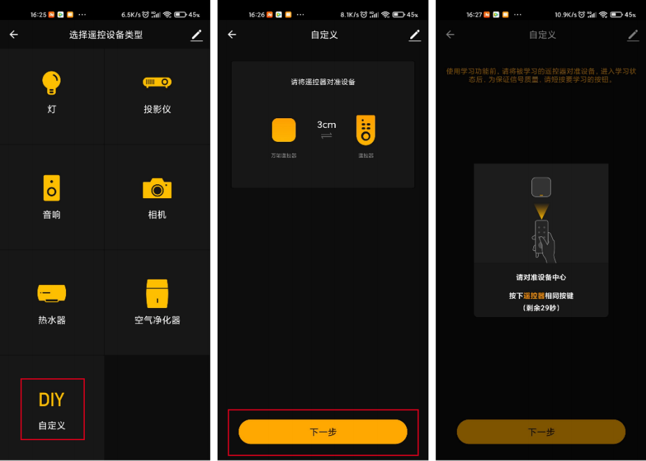 如找不到对应的电器种类或者电器品牌,可进行自定义学习遥控器,如下图,选择“DIY 自定义”,进入自定义学习。