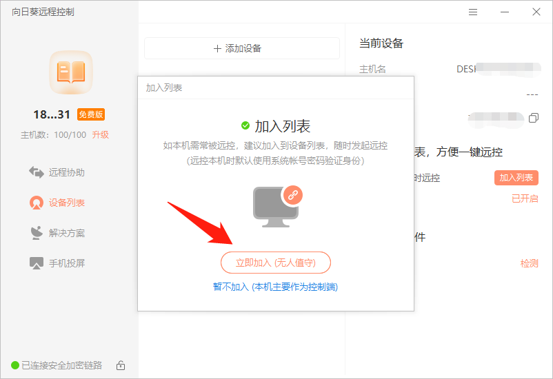 出差旅游之前,先在办公电脑下载向日葵远程控制软件,注册并登录,将办公电脑加入“设备列表”,设置一个访问密码加强安全防护。