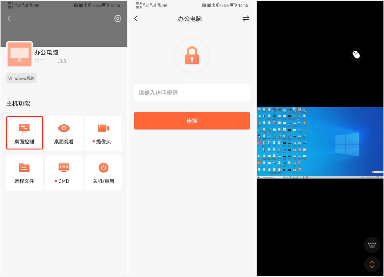 需要控制办公电脑处理问题时,只需打开随身携带的手机,找到在线的“办公电脑”,选择【桌面控制】,再输入之前设置的访问密码,就可以连接办公电脑调用文件、访问OA、ERP等办公系统进行办公了。而且,远程操作中还可以开启「黑屏」模式保护隐私,防止被控电脑画面被偷窥。