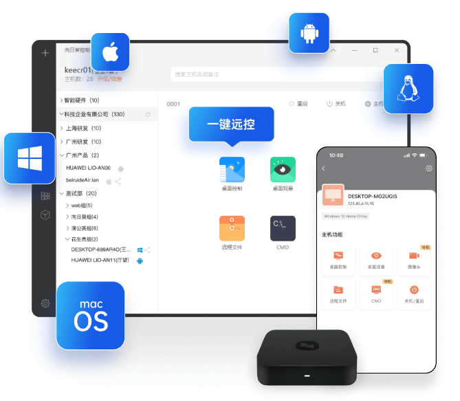 在公司主机部署向日葵客户端软件,外网可以通过多种系统平台(电脑/手机/平板)随时随地远程查看、编辑公司电脑资料,操作PPT等;运维人员可直接通过命令行模式进行设备调试,在不影响员工正常使用公司电脑的情况下。