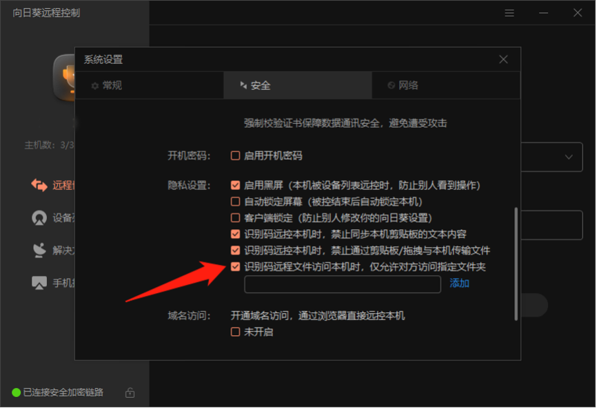 在远程设计过程中用户隐私信息的防护也是十分重要的,为了能给使用者打造一个安全可靠的远控环境,向日葵远程控制设置了一系列人性化的安全实用防护功能。