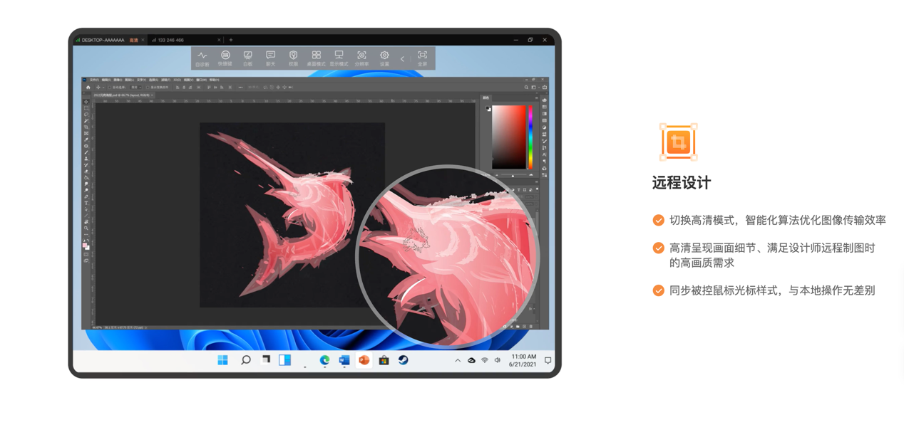 考虑到并不是每位设计师家中都有可以跑动设计软件的高配置电脑,为满足设计师们在家就能够处理设计工作的述求。向日葵远程控制还对操作方式以及远控流畅度进行了相对应的优化适配,例如,在远控操作Photoshop时,能同步显示被控端鼠标指针样式,做到远程与本地操作无差别,你相当于就拥有了一台高配置的“云主机”,获得了良好的设计体验也就能保证远程办公的效率了。