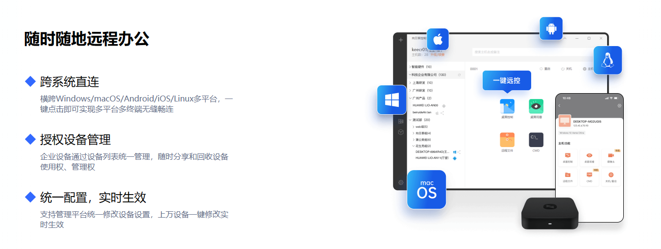 向日葵远程控制软件是一款支持跨平台、并可以进行远程监控的远程控制工具。用户可以通过向日葵远程控制软件,实现对不同主流操作系统的远程控制,包括 Windows、Mac OS、Android、iOS 等操作系统。有了这款远程控制工具,你可以轻松地实现电脑、手机、平板电脑等不同设备的互控,让你的远程工作变得更为便捷和高效。
