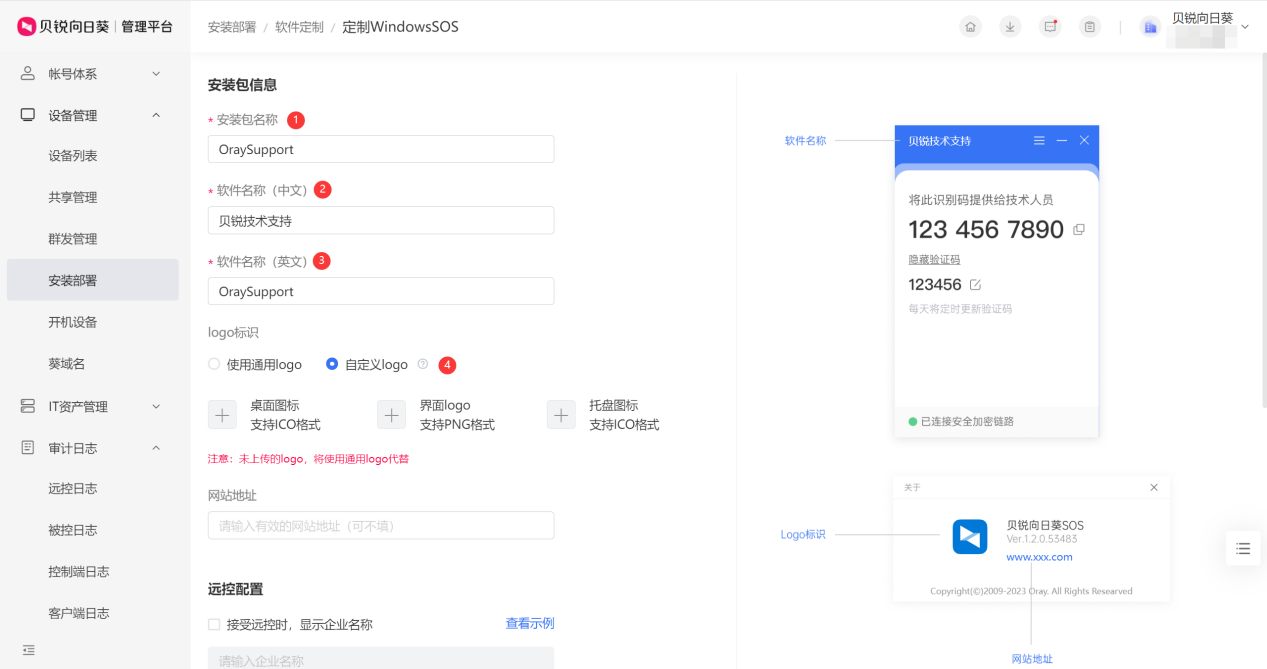 我们现在可以在贝锐向日葵管理平台【设备管理】-【安装部署】-【定制软件】-【添加】菜单中找到SOS版选项,目前支持Windows版定制。