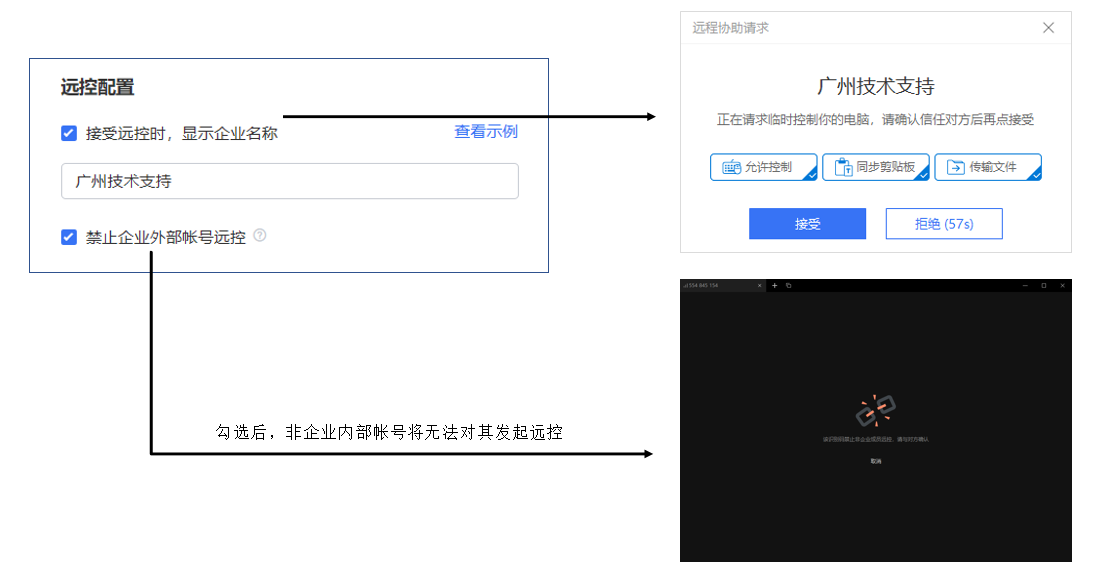 为了进一步帮助企业更好的实施远程技术支持,向日葵SOS版支持自定义远程协助发起时被控端弹窗所显示的企业名称,同时支持设置“禁止企业外部账号远控”,从而保证远程技术支持服务的安全和私密。