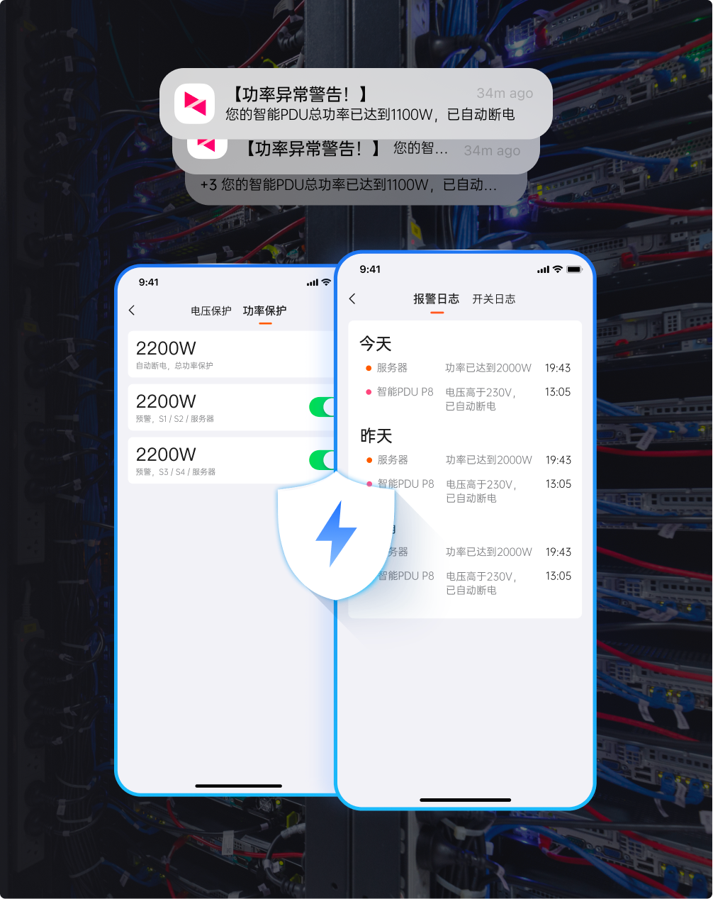 贝锐向日葵智能PDU P8配备了用电保护功能,可对电流进行过载保护和过载自动预警,通过贝锐向日葵远程控制APP,对贝锐向日葵智能PDU进行自定义设置,在触发自定义设置的保护值时,可以设置“自动预警推送”或是启用设备“自动断电”,也可通过贝锐向日葵控制端App即可轻松远程关闭设备,根据用电保护策略自动切断PDU排插口电源。