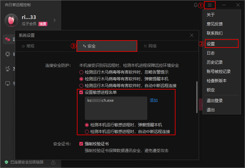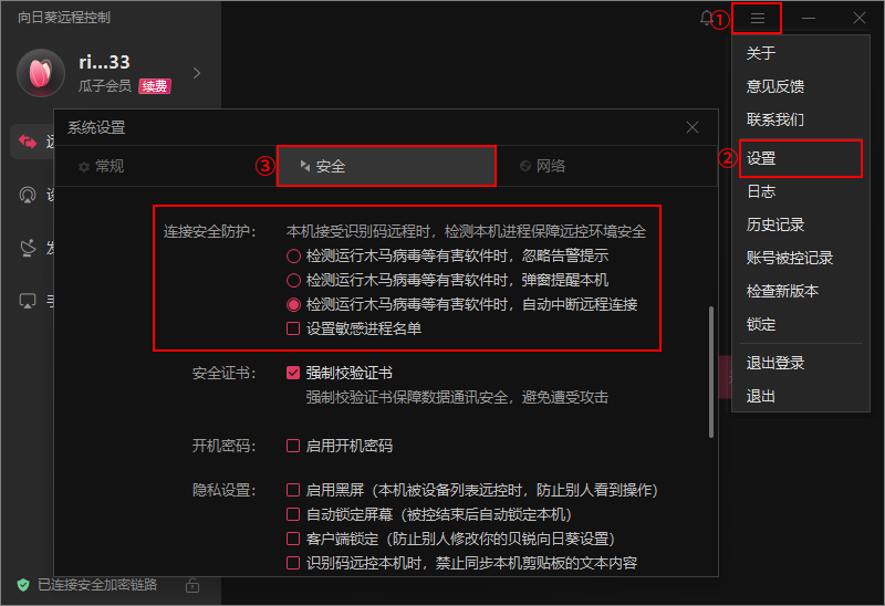 向日葵15还包含更多的安全远控功能,可在向日葵主界面【三】->【设置】->【安全】中进行查看或自定义设置。
