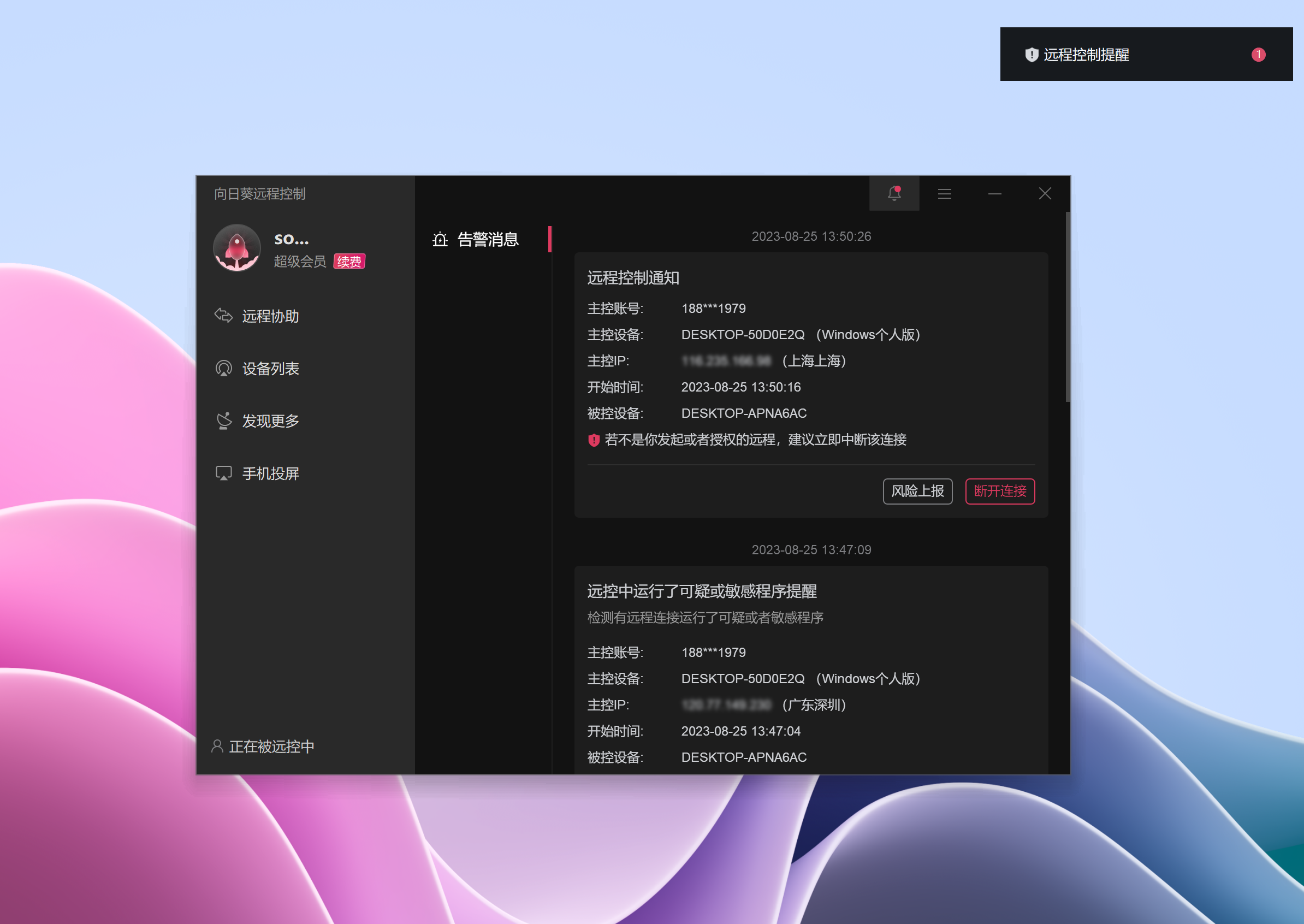 (2)当我们接受识别码远控时,向日葵同样提供了多个渠道的远程控制行为通知告警,会第一时间收到对应的通知,包括微信公众号、手机APP、桌面客户端。
