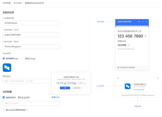 在这方面,向日葵技术支持解决方案中涉及的向日葵软件控制端、客户端、SOS版均支持定制,我们可以定制企业名称、logo等,也可以自定义客户接受远控时显示的发起方名称,使外提供服务时,远控软件呈现统一、专业的形象。