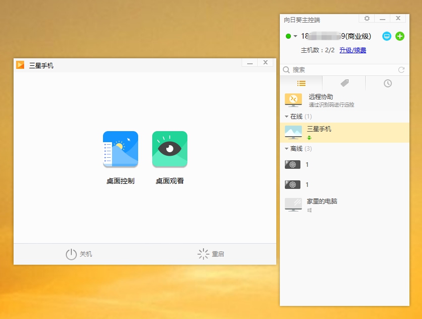 向日葵不仅能够实现电脑控制电脑、手机控制电脑,还能够让电脑控制手机、手机控制手机。控制手机目前有两个功能,分别是“桌面控制”和“桌面观看”。字面意思,就是一个控制手机桌面,一个只是观看手机桌面。