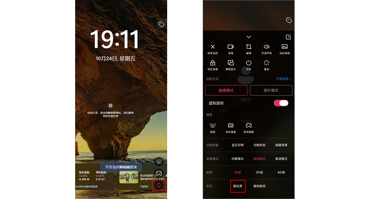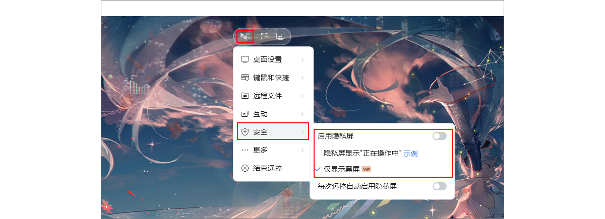 启用“隐私屏”功能。将立即黑屏办公室那台Windows电脑的物理显示器,使屏幕内容对办公室内的其他人不可见。 操作步骤:【远控菜单】->【安全】->【启用隐私屏】 电脑端入口: