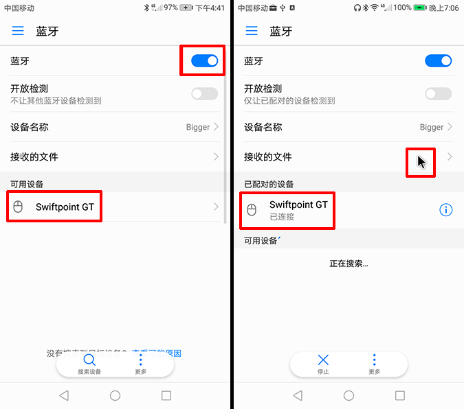 开启手机中的蓝牙功能,即可扫描到GT鼠标,点击鼠标名称即可完成连接;