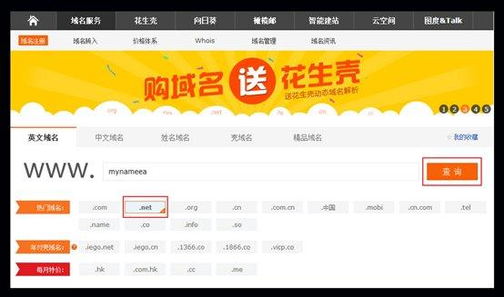 第一步,打开【域名服务】页面:http://domain.oray.com/, 输入您要注册的域名,选择后缀,点击“查询”。