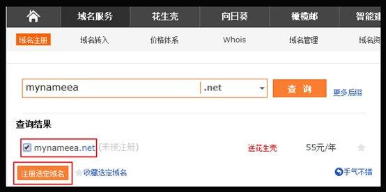 第二步,进入【查询结果】页面,勾选您要注册的域名,然后点击“注册选定域名”。