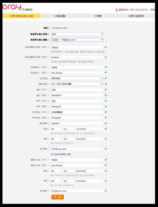 第三步,进入【注册域名】页面,填写域名注册信息后点击“下一步”