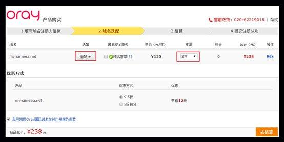 第四步,选择“注册年限”、“选配”,并勾选“我已同意贝锐域名在线注册服务条款”,点击“结算”便可完成域名的注册了。
