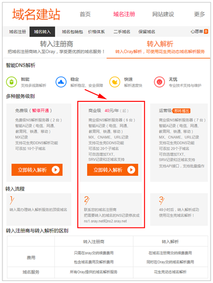 注意:转入域名管理服务基本服务费用是40元起/年/域名(支持域名的A记录、MX记录及可添加5个子域名记录),用户可根据自身需求选择域名功能配件。