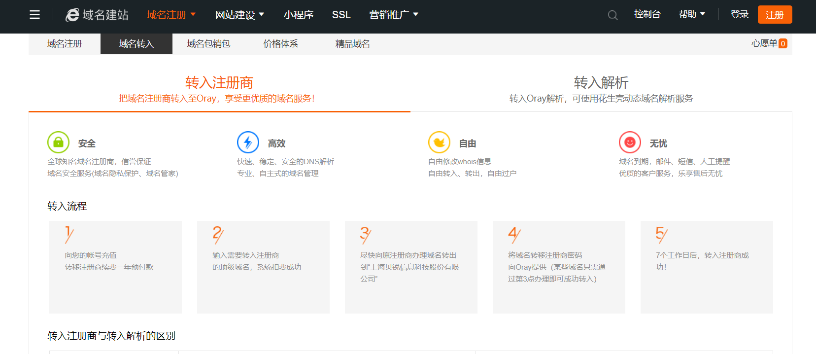 域名服务商往往会提供很多域名相关的服务,现在以oray为例,介绍一下贝锐域名注册后有什么功能服务。在贝锐注册一个域名,免费域名状态变更通知,免费域名锁定,较为稳定的空间。