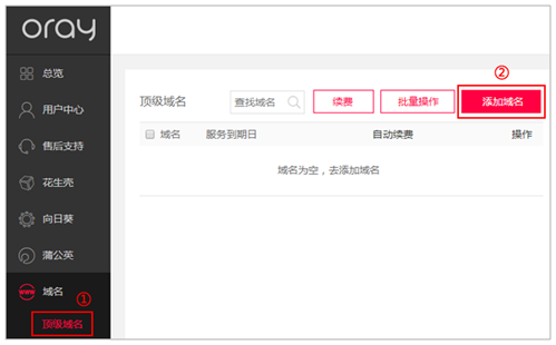 首先,登录花生壳官网并进入 【管理中心】——【域名】——【顶级域名】,点击界面右上角【添加域名】按钮。